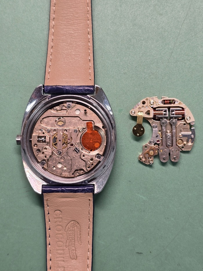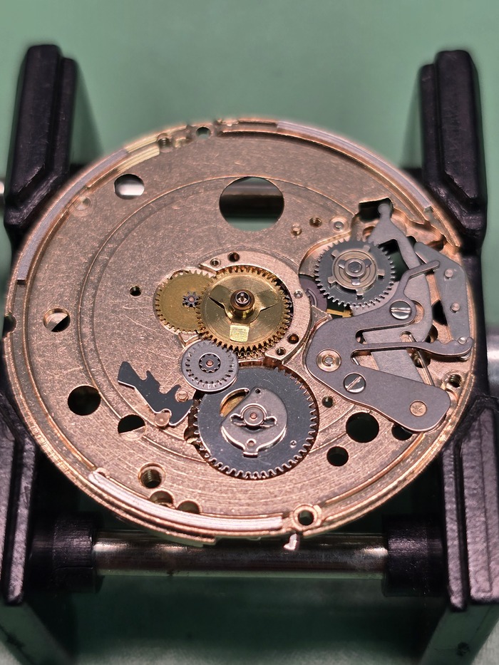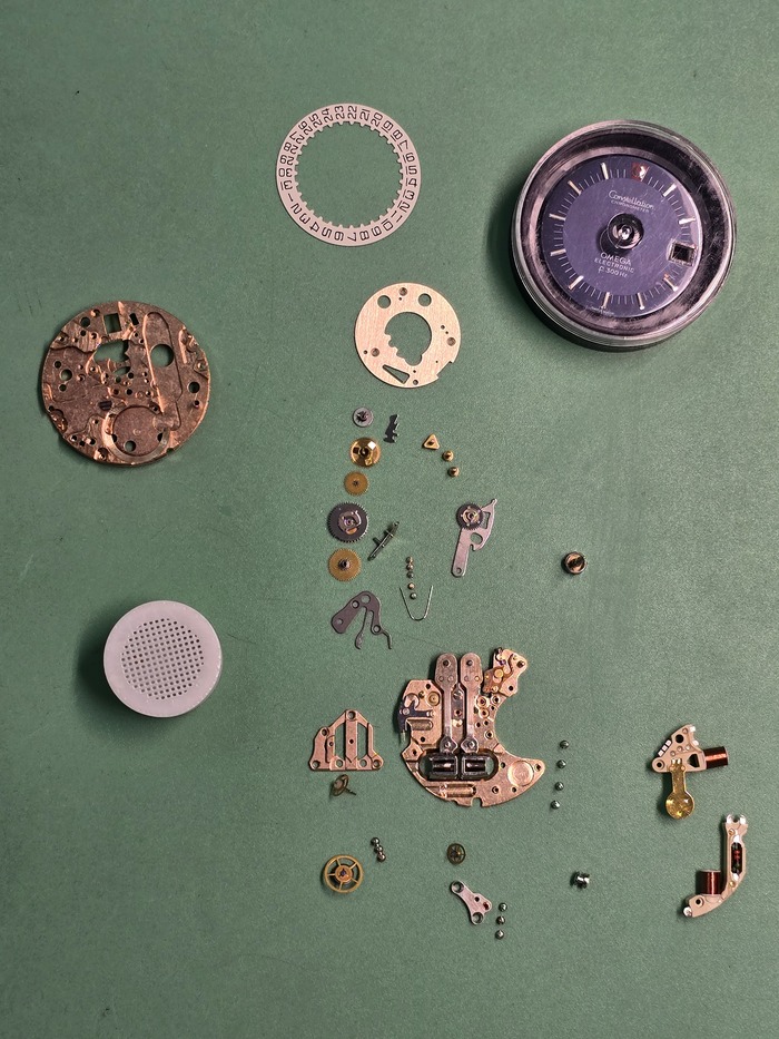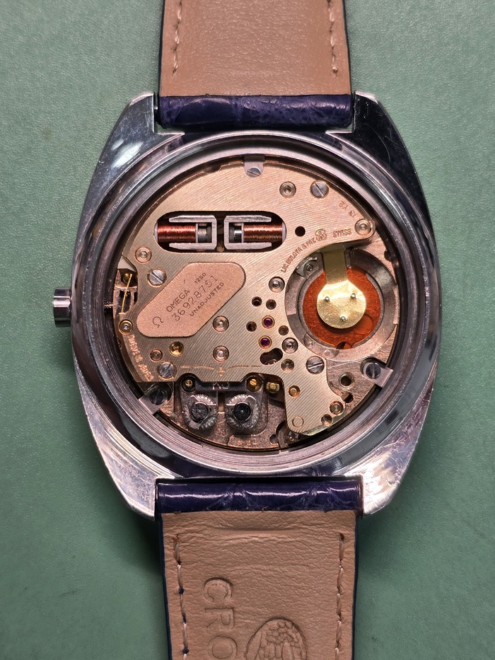 Omega Cal.1250 - перелицованный esa 9162, камертонная машина без всяких там кварцевых помощников. Из электроники внутри только 3 компонента - транзистор, резистор и конденсатор. Ну и пара катушек, которые толкают камертонную вилку. По идее, оно должно быть надёжным и простым как гвоздь, но нет. Главная проблема этих машин - качество ультразвуковой пайки тонких проволочек к колодкам. Со временем, места пайки окисляются и часы встают раком. На втором месте по количеству отказов - диск календаря. Какой-то сверхразум догадался делать эту деталь из пластика. С учётом того, что календарь мгновенного действия, это была так себе идея.