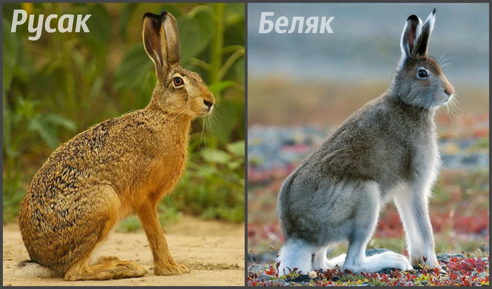 Беляк и русак – этих зайцев знают все. Обычные звери наших лесов (беляки) и степей (русаки). Русак крупнее и отличается по цвету, но по храбрости они равны: стоит человеку подойти ближе – пускаются наутек.