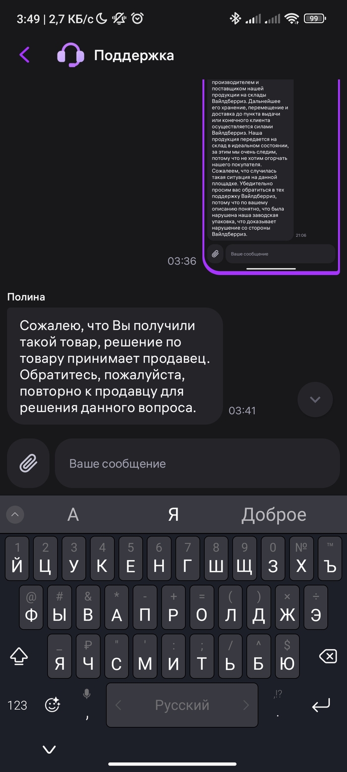 Пишу что продавец ответил что это не его вина и мне надо обратиться в поддержку! На что мне отвечают что с ними не связывался в чате! Лладно пишу продавцу в чате, описываю ситуацию, он мне отвесает также как и при первом обращении на возврат.