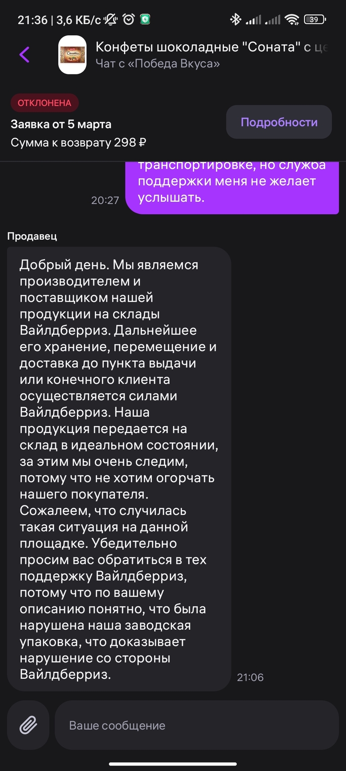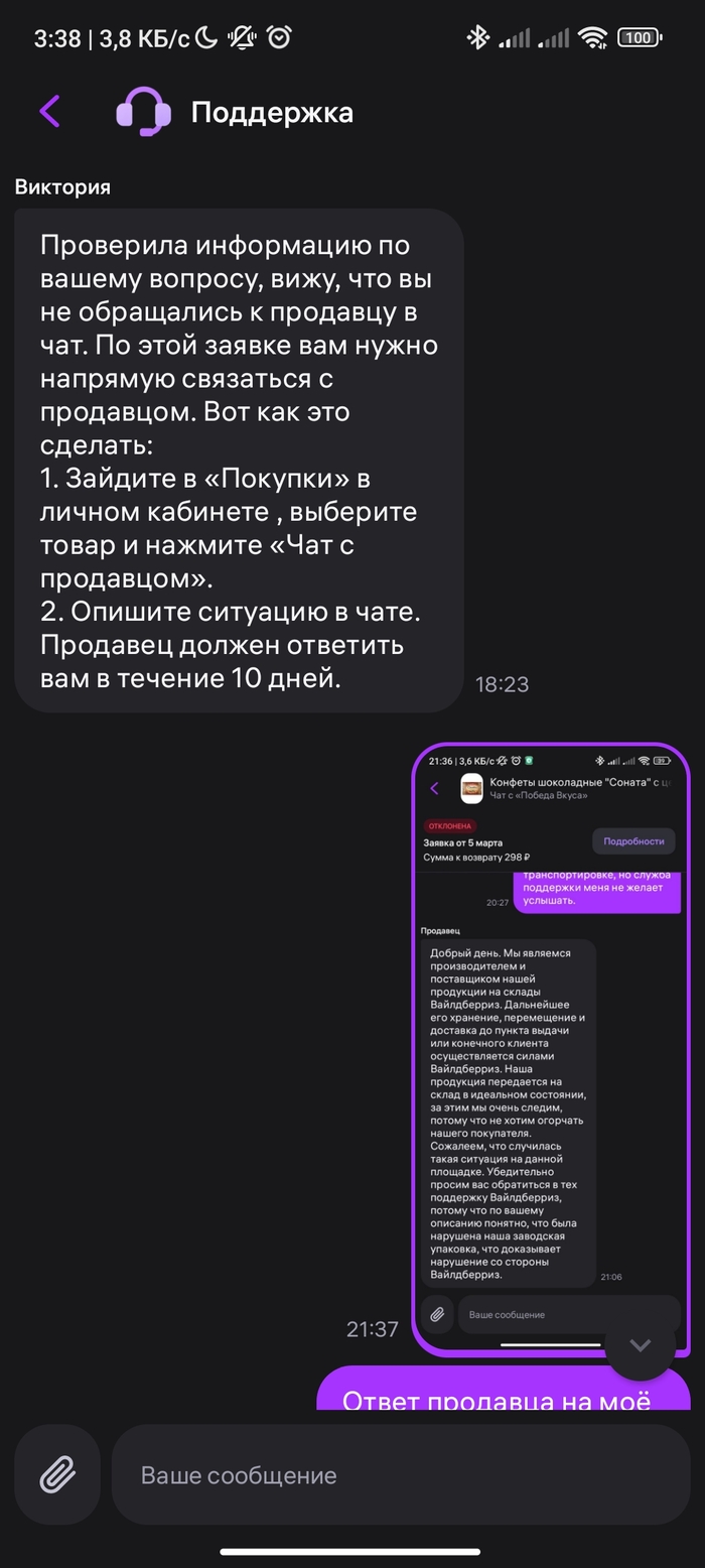 Ну что идем в магазин, ищем похожую коробку конфет для поздравления и начинаем попытки вернуть не вернуемое😅. Нажимаю возврат по браку, все фотаю описываю и жду ответа. Продавец, естественно, я не виноват, она сама такая пришла! У меня все красиво, пишите в поддержку! Пишу в поддержку, бот предлогает оспорить. Оспариваю, спецы ВБ согласны с продавцом...
