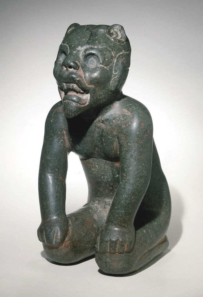 В культуре коренных народов Южной Америки существовало множество богов-ягуаров, однако я честно признаюсь, что пока недостаточно компетентна в этой теме, чтобы с уверенностью рассказывать о чём-либо, кроме самого факта их наличия. А конкретно в этой статуэтке культуры ольмеков исследователи видят даже не божество, а шамана во время трансформации и превращения в ягуара.