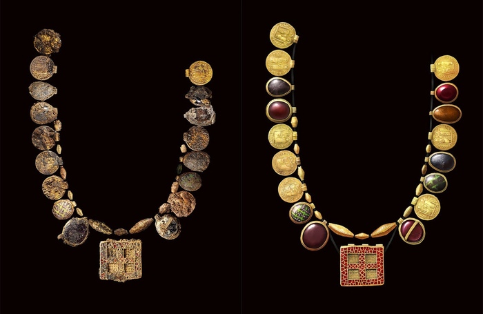 Это оказался прямоугольный кулон с гранатами. В центре ожерелья также находились подвески, вырезанные из золотых римских монет и полудрагоценных овальных камней.
