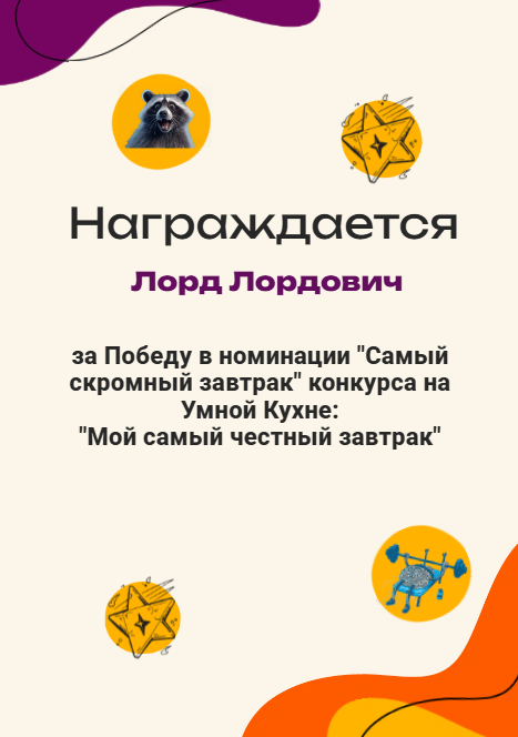 Всем привет! Подведены итоги конкурса "Мой самый честный завтрак" на канале "Умная Кухня" Нами были определены 3 победителя в 3-ех номинациях Им направлены именные грамоты и небольшие подарочки через Озон: в г. Самара, в г. Москва и в г. Екатеринбург