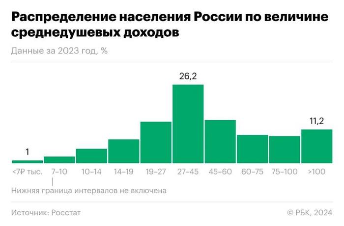 Что же, давайте посмотрим, кому удалось "устроиться": вот данные Росстата по распределению населения по среднедушевым доходам. Всего 11% людей получают больше 100 000 рублей.
