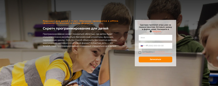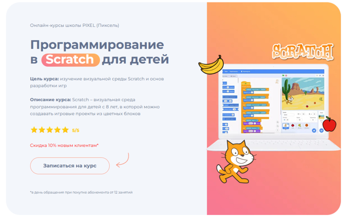 Возрастные рамки: запись на курс программирования в Скретче доступна ребятам от 8 до 12 лет.