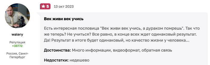 1) Eduson Academy. Пользователь поставил 5 звёзд и отметил, что учиться нужно всегда: много информации, видеоформат, есть обратная связь. Недостаток — курс стоит недёшево.