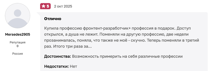 4) Скилбокс. Студентка рассказывает, что купила профессию «Фронтенд-разработчик + профессия в подарок». Сначала направление не понравилось, затем ещё два раза меняла профессию, пока искала подходящее. Отмечает, что это полезный опыт.