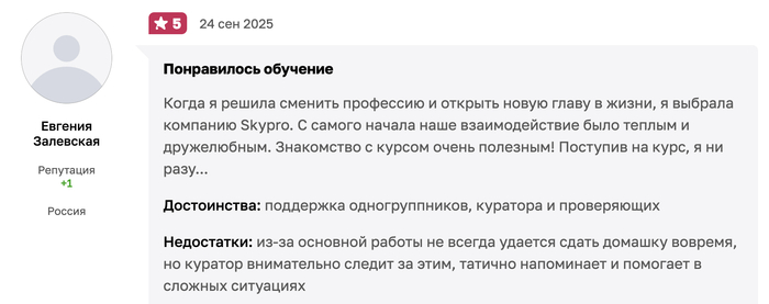 2) Skypro. Автор поставила 5 звёзд, отметила тёплое и дружелюбное взаимодействие с самого начала, полезность курса и поддержку одногруппников, куратора и проверяющих. Недостаток — сложно совмещать с основной работой, не всегда удаётся сдавать задания вовремя, но куратор следит, напоминает и помогает.