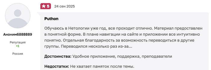3) Нетология. Студент учится уже год, доволен подачей материала, отмечает удобную навигацию на сайте и в приложении, а также возможность переходить в другие группы. Плюсы — удобное приложение, поддержка и преподаватели. Минус — не хватает памяток после тем.