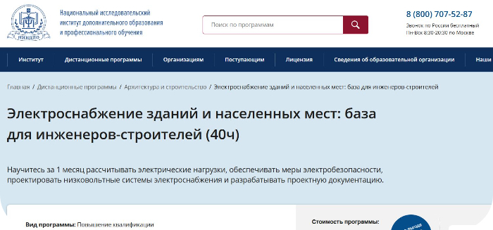 4. «Электроснабжение зданий и населенных мест» [НИИДПО] — курс за 1 месяц (40 часов). Учат проектированию электрических систем, мерам безопасности. Подходит для понимания электротехнической базы, необходимой инженерам АСУ ТП. Удостоверение о повышении квалификации, рассрочка от 1 380 ₽ каждые 2 недели.