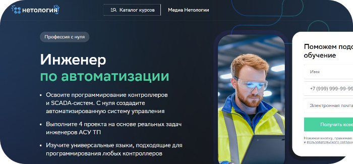 1. «Инженер по автоматизации» [Нетология] — курс длится 13 месяцев. Единственная полноценная программа по промышленной автоматизации: учат программированию PLC контроллеров, созданию SCADA-систем, работе с АСУ ТП. Обучение автоматизации производства с 4 проектами в портфолио, диплом о переподготовке по гослицензии. Рассрочка от 2 811 ₽/мес., налоговый вычет 13%.
