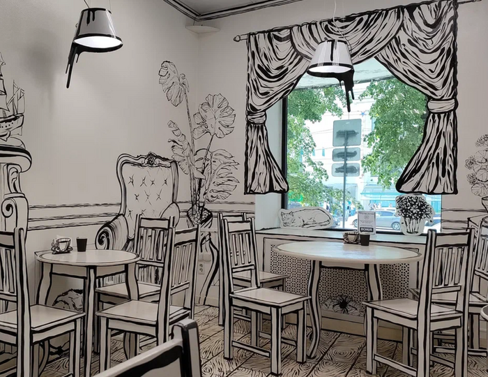 В Челябинске мы все уже были, поэтому особо ничего не планировали. Решили зайти в интересную кофейню с необычным интерьером — «Кофе Рояль».