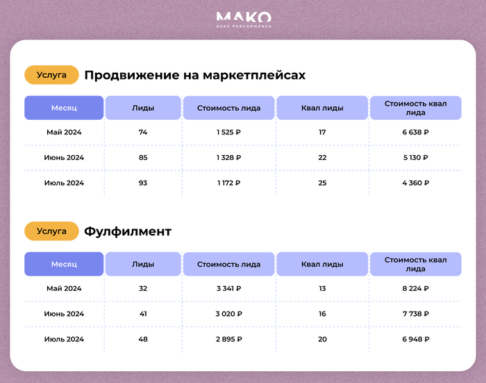 продвигали 2 услуги с разными ЦА (продвижение на маркетплейсах и фулфилмент) по разным стратегиям;