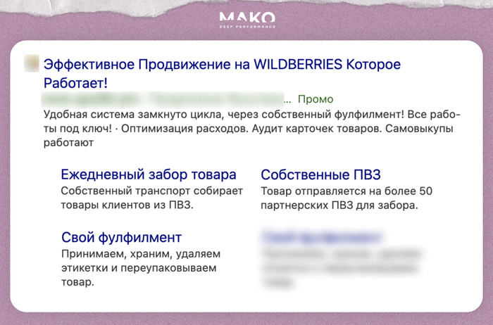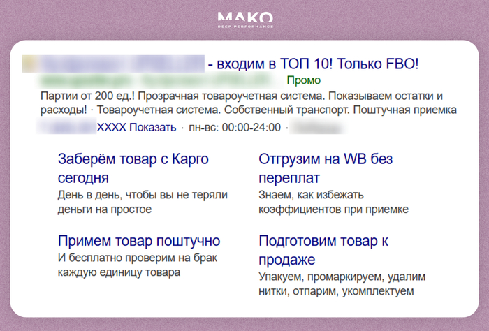 Поэтому классический подход к семантике не срабатывал: здесь важен не объём трафика, а попадание в конкретный болевой запрос. Поэтому основным источником лидов стала поисковая кампания. В объявлении указали самые важные для ЦА преимущества: все работы под ключ, аудит карточек товаров, ежедневная отправка товаров, свой фулфилмент.