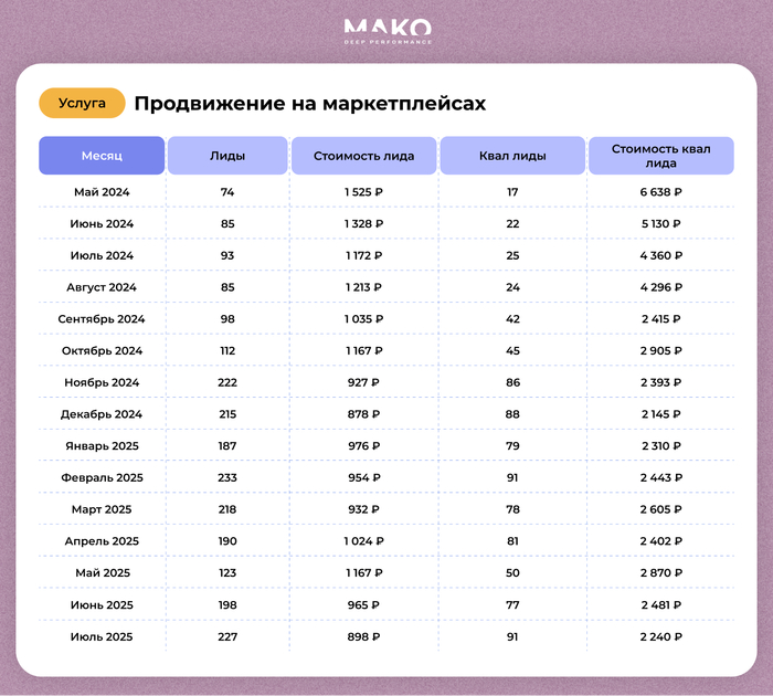 Также снизили стоимость лида. По услуге продвижения на маркетплейсах в первый месяц лид стоил 1 525р, на третий месяц 1 172р. По фулфилменту в первый месяц - 3 341р, в третий месяц - 2 895р.