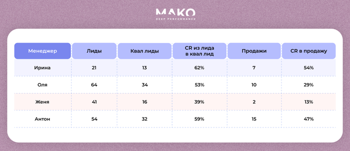 Позже добавили ещё один уровень детализации — вкладку с анализом работы менеджеров. Так стало видно, кто из сотрудников отрабатывает лиды хорошо, а кто «проседает»: выяснилось, что у одного менеджера конверсия в два раза ниже, чем у остальных. Она не дожимала покупателей и не следовала скрипту по обработке лидов.