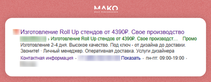 написали заголовки с конкретными преимуществами: — «Ролап с печатью от 2990 ₽» — «Производим сами — срок от 2 дней» — «Гарантия, доставка по Москве»