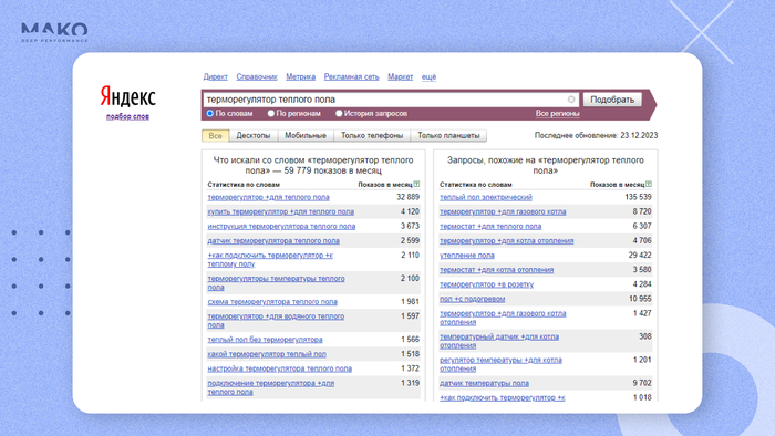 Чтобы карточка попала в ТОП поиска она должна содержать востребованные и соответствующие товару ключевые фразы в названии, описании и характеристиках. Релевантные ключи мы искали с помощью трех сервисов: Wordstat (сервис для поиска информации о запросах пользователей), Google Ads планировщик (инструмент контекстной рекламы) и MarketGuru(сервис аналитики для МП).