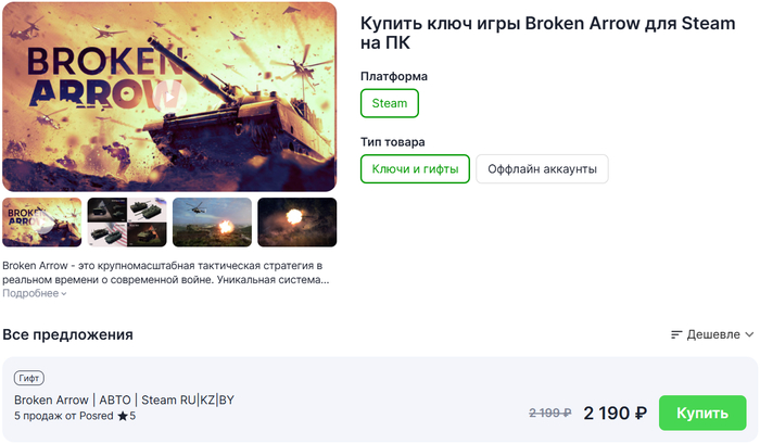 На сайте ggsel нажимаем на поисковую строку и ищем «Broken Arrow». Находим нужный нам товар. Помимо цены рекомендуем обращать внимание на продажи, отзывы и рейтинг продавца.