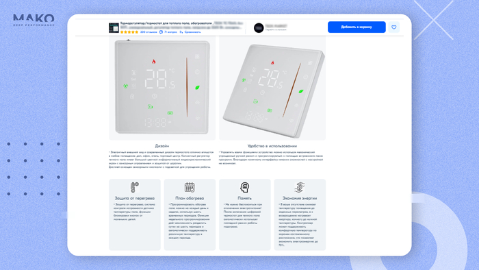 Как правило, терморегуляторы производятся в Китае и приходят в Россию с руководством на китайском и английском языках. Простому обывателю, не владеющему ими, сложно разбираться с такой «китайской грамотой». Ему нужна доступная подача информации, которую продавцы товаров почему-то не предоставляли. Мы предложили нашему клиенту перевести руководство на русский язык, использовали полученную информацию в карточке и вкладывали распечатку в упаковку с товаром. В этом тоже выгодно отличились от конкурентов.