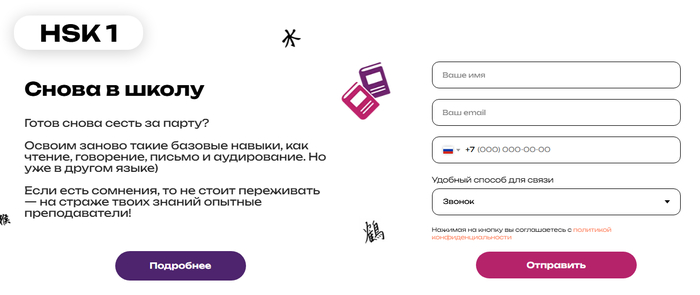 Академический подход: программа по объему сопоставима с одним семестром в языковом вузе, акцент на подготовку к HSK1.