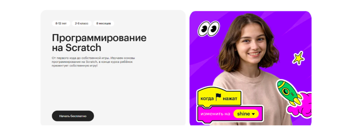 Что включено в программу занятий: уроки основаны на написании визуально-блочного кода в Скретче – среде, предназначенной для ребят без опыта в программировании. В результате прохождения курса удастся понять основы кодинга, создания простых игр и не только.