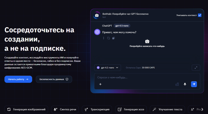 Не просто сайт, а полноценный каталог и консоль для работы с искусственным интеллектом. Здесь собраны десятки ИИ-инструментов, доступных на российском рынке, от текстовых и графических генераторов до видео- и аудио-платформ. Пользователь может сравнивать возможности разных сервисов, находить подходящие решения для конкретных задач и тестировать их прямо в интерфейсе. Bothub.ru фактически выполняет роль «маркетплейса» ИИ, где можно быстро подобрать нужную модель под любой запрос — от генерации визуала для рекламы до написания сценариев для видео.