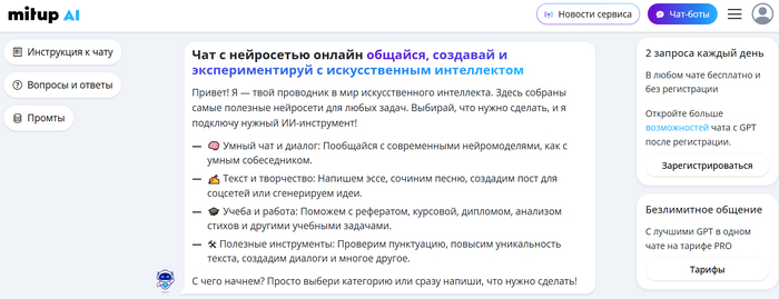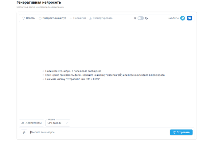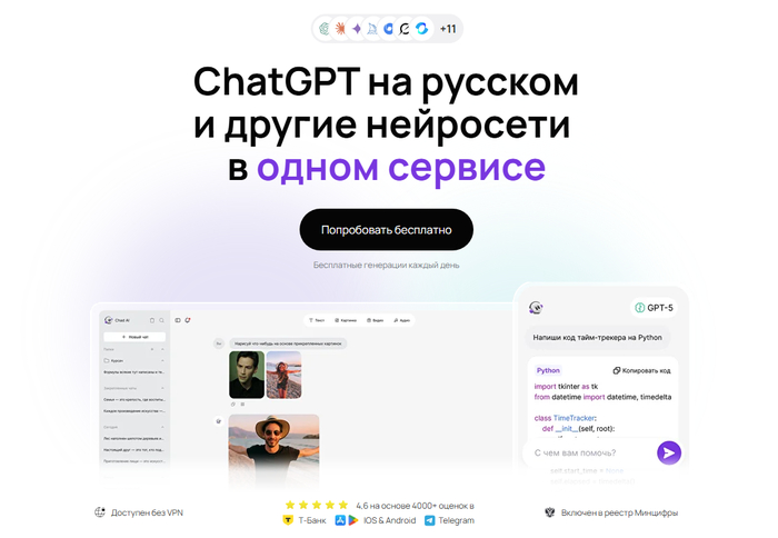 Что умеет: Онлайн-чат с несколькими ИИ-моделями: генерация текстов, создание изображений, выполнение заданий, рерайт.