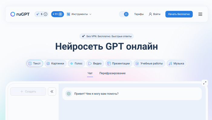 Что умеет: Русскоязычная генерация текстов: статьи, письма, отчеты, рерайт. Можно выбирать нейросеть для конкретной задачи.