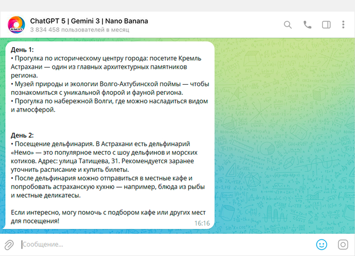 Обычно удобно, она хорошо подсказывает достопримечательности. Но не всегда. Например, прошу посоветовать, куда сходить с семьёй в Астрахани. Нейросеть рапортует: «Обязательно посетите астраханский дельфинарий «Немо» и даже предлагает адрес.