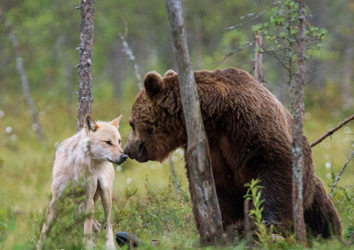 Согласно исследованиям, в Скандинавии более 50% добычи волков сначала пробуют мишки. Но это не потому, что медведи такие злые и плотоядные. Просто на полуострове обитает примерно 600-800 волков и более 3000 медведей. Поэтому в округе всегда есть какой-нибудь голодный и наглый косолапый!