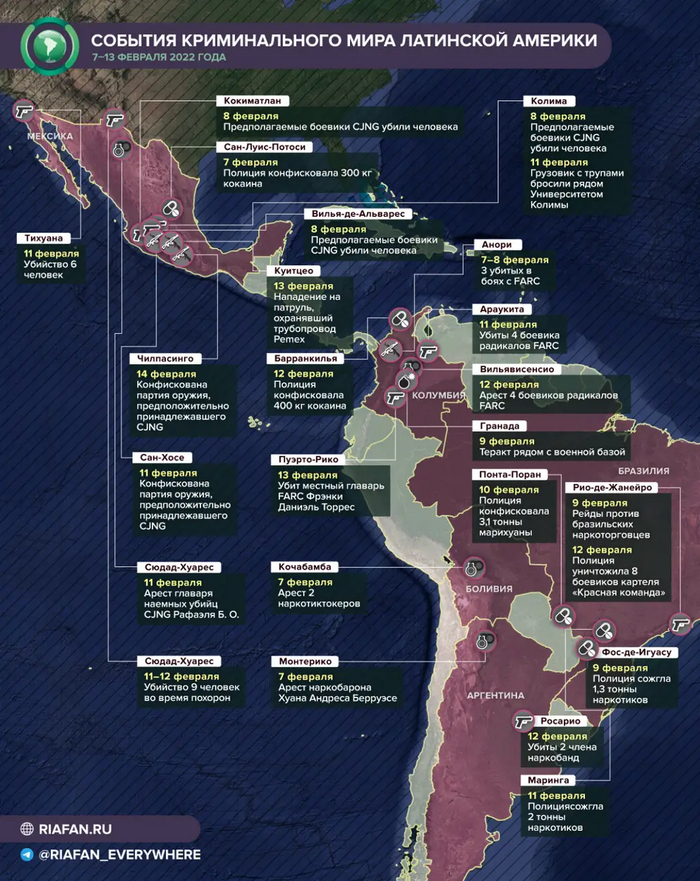 В Боливии торговля кокаином перемещается в TikTok. В Колумбии очередного генерала арестовали за тесные связи с местными наркосиндикатами. Власти страны обвинили радикалов «Революционных вооруженных сил Колумбии» (FARC) в подготовке серии терактов, которые должны были сорвать предстоящие президентские выборы.
