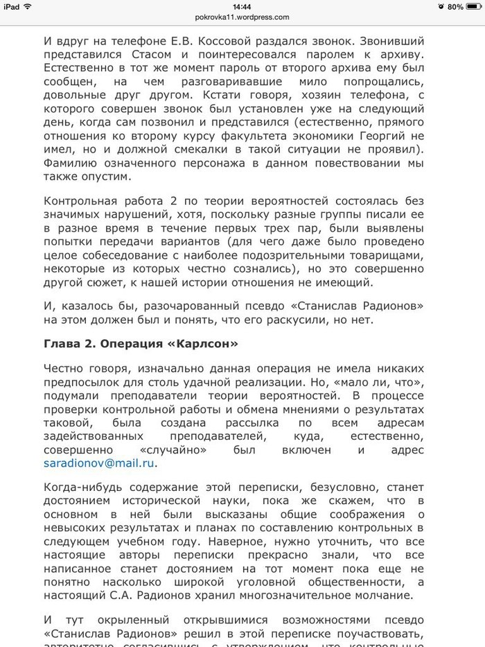 «Прошло чуть больше года с великого разоблачения списывальщиков кафедрой ТеорВера и МатСтата. Посты давно удалили с porkovka11.wordpress.com, но они должны стать национальным достоянием :)»