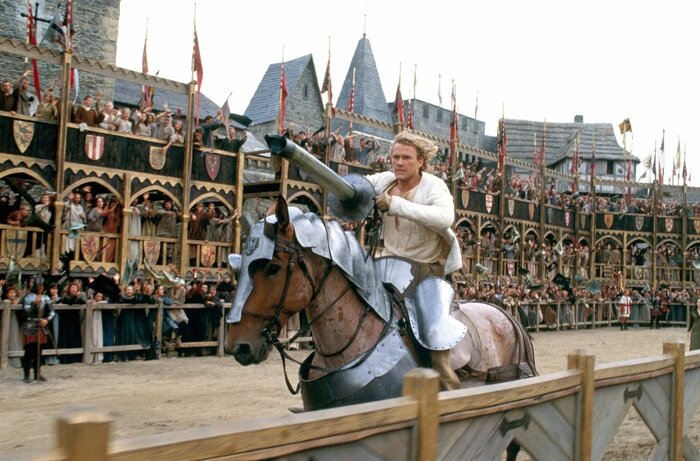 Рыцарские поединки. Опять-таки, хуй его знает, как там они правильно дрались, но в фильме всё выглядит пиздато до сих пор. Копья, которые чуть ли не взрываются, ломаясь о головы рыцарей, — это же олдскульный экшен, старая школа, мёд! Каскадёры прыгают, падают, хуячатся как бешеные, и всё это без зелёных экранов — вживую. Даже Хит Леджер половину трюков делает сам, а на тренировках выбил к хуям передние зубы режиссеру... случайно.