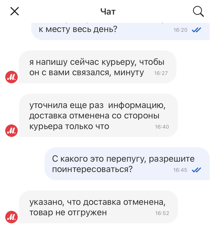 Я: как так? Я проверял наличие товара, статусы по заказу. Да и не вышел же курьер на маршрут, если товар не забрал? А если б его не было - мне бы позвонили/написали хотя бы утром.