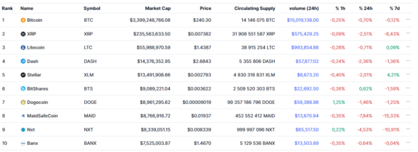 Мысленно вернёмся в 2015 год. В топе криптовалют — Bitcoin, XRP, Litecoin, Dash, Stellar и другие малоизвестные (на сегодняшний день) монеты.