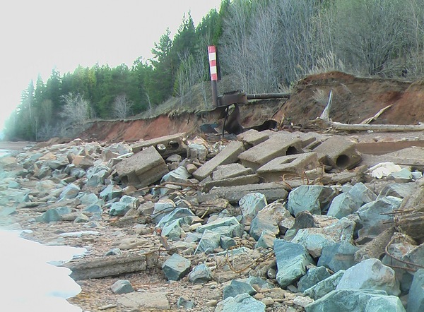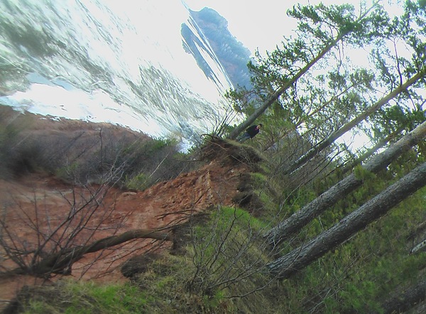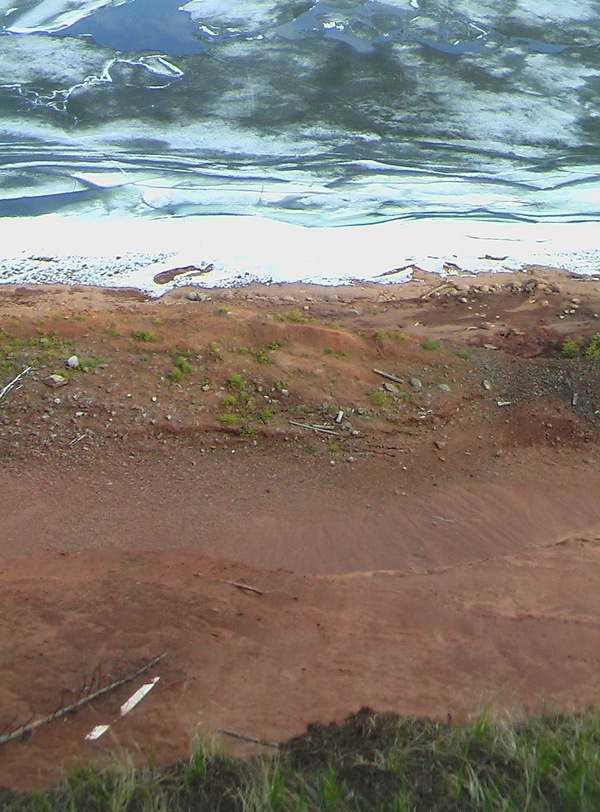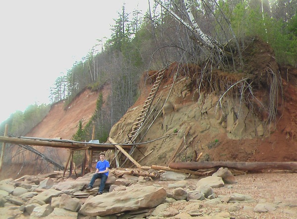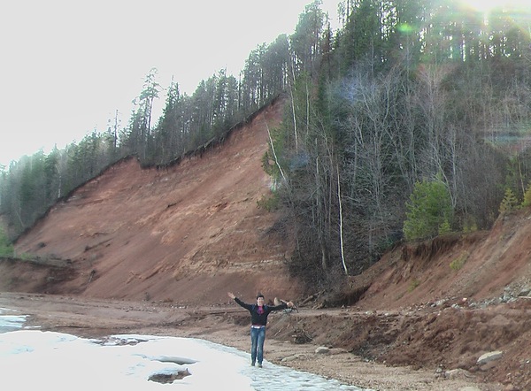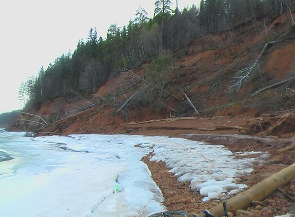 Но радость была не долгой. Пошли оползни. Причем самые крутые я не заснял, но они были в половину высоты обрыва и уходили в воду, поэтому нам приходилось штурмовать их с великами на шее (по глине, песку, поваленным елям.)