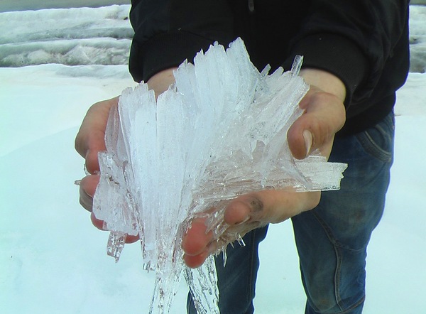 Лед состоял из «стоячих» ледяных сосулек, кидались им как дети))