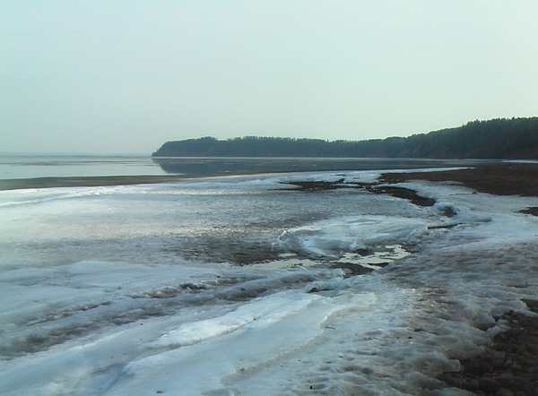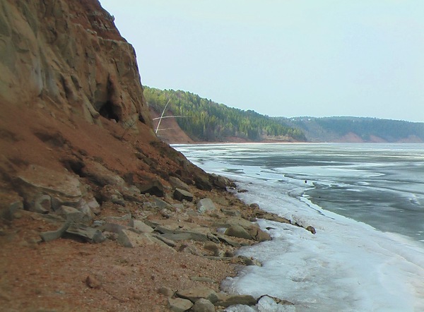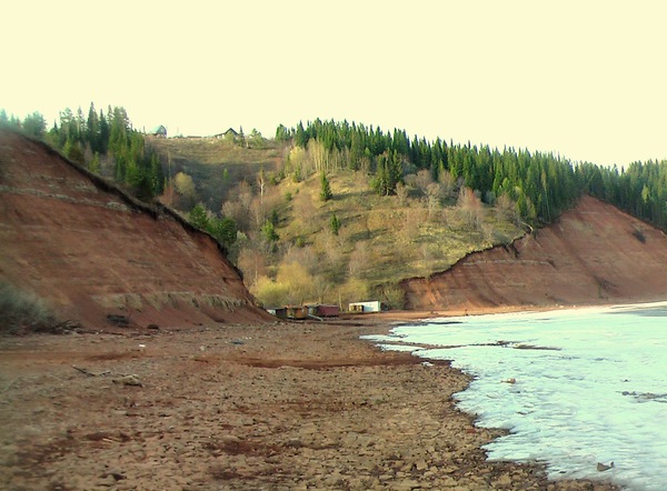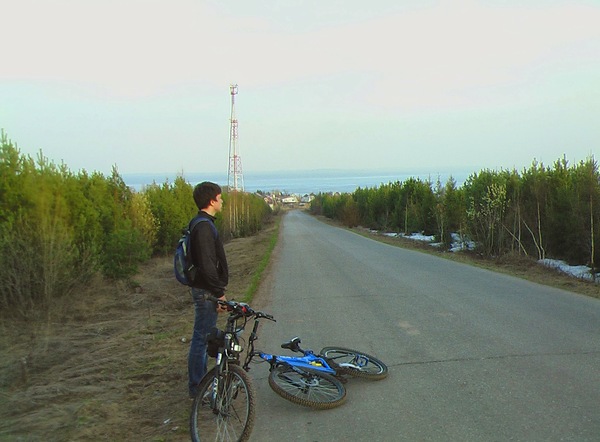 Спустившись ничего сверхъестественного не обнаружилось, это оказалось хижина рыбаков, в ветхом состоянии. Подниматься на верх с великами не было желания, да врятли бы поднялись, поэтому было решено идти вдоль Камы (а точнее ехать) до Галево. Кстати, забыл добавить, так как все происходило в апреле, уровень воды был сильно снижен, что позволяло идти по затопляемой земле.