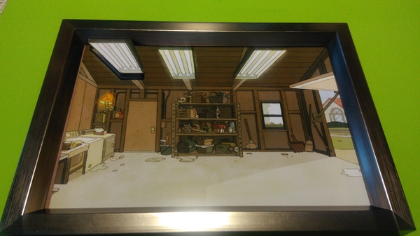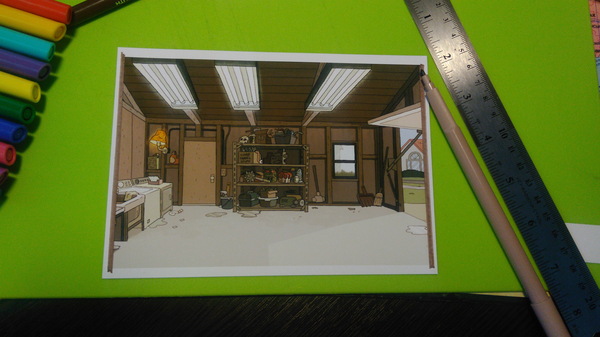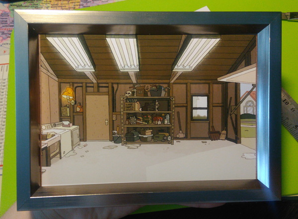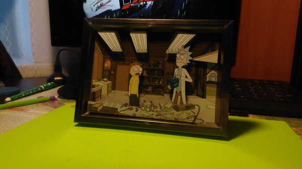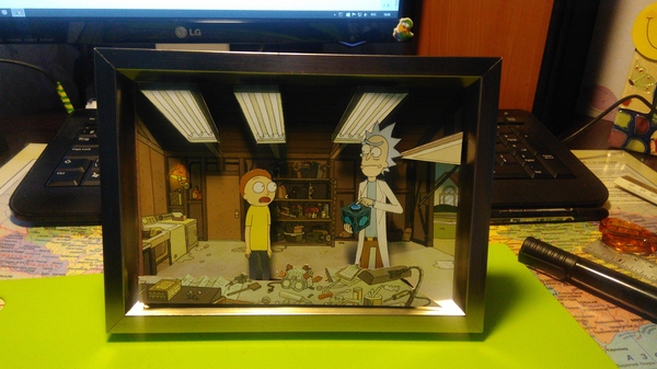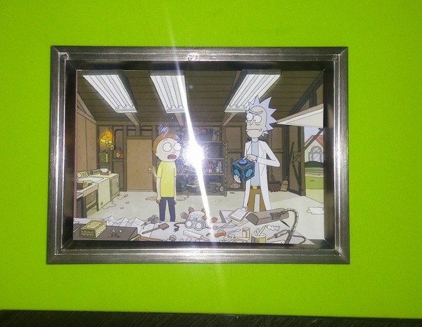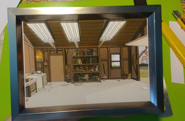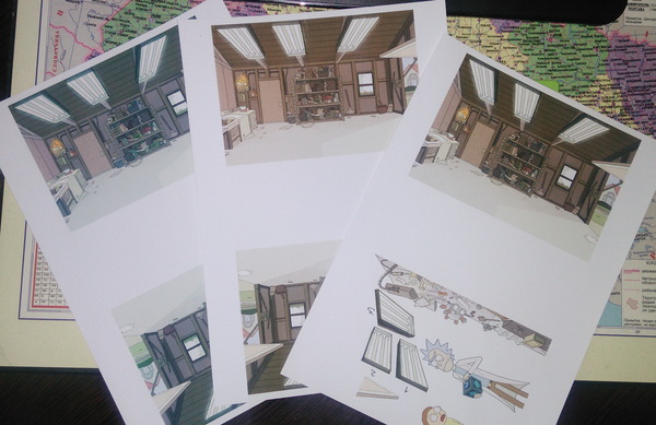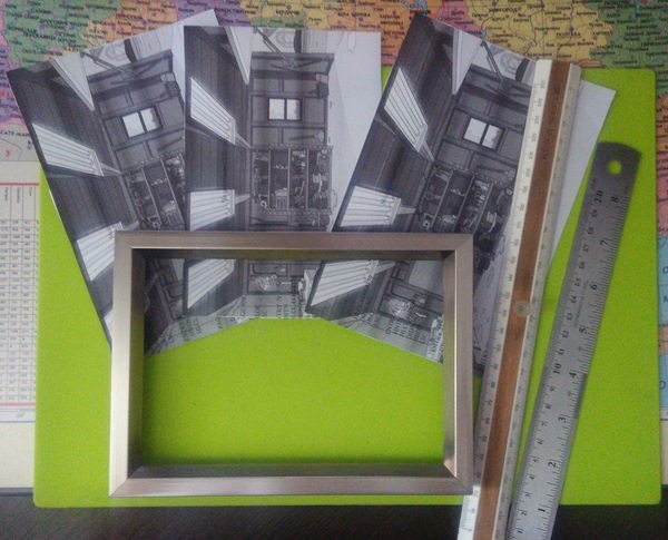 Берём исходники для печати из поста http://pikabu.ru/story/diorama_rik_i_morti_4108461 и пытаемся методом тыка/ подбора/ расчёта выяснить, какого же размера нам нужно напечатать фон, чтоб он вышел как раз по размеру открытой части рамки.