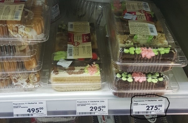 Но он не понял, что это был ценник от других пирожных (настоящий слева):
