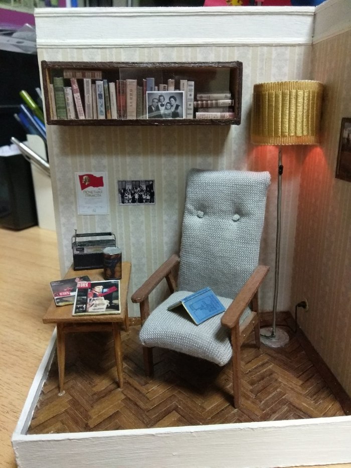 Размеры макета комнаты : фотографии 1.5 см на 1 см., торшер : высота - 10 см., колпак торшера - 1.8 см. и диаметр - 1.5 см.