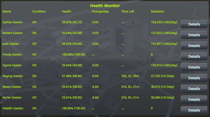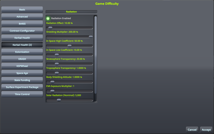 Находясь на задании, кербонавты постоянно подвергаются облучению радиацией. Сила облучения зависит от места, где находится огурец: на низкой орбите Кербина не так страшно, как в межпланетном пространстве. Причем небесные тела без магнитного поля будут тоже нехило фонить в том числе и для тех, кто на поверхности.