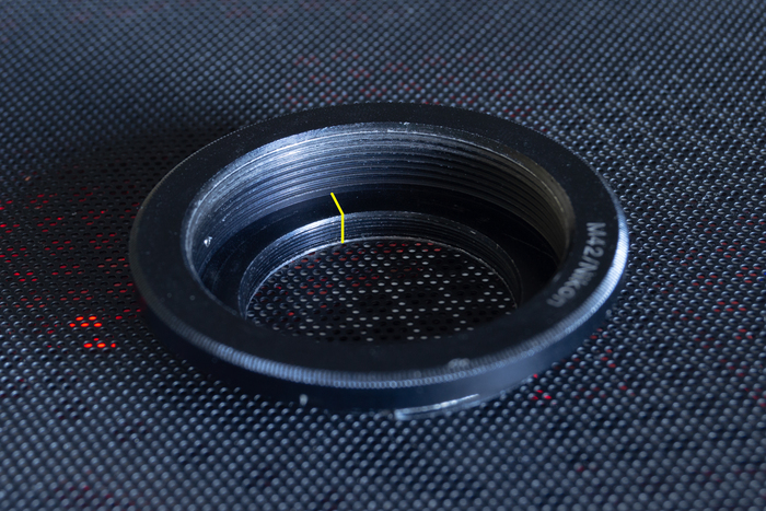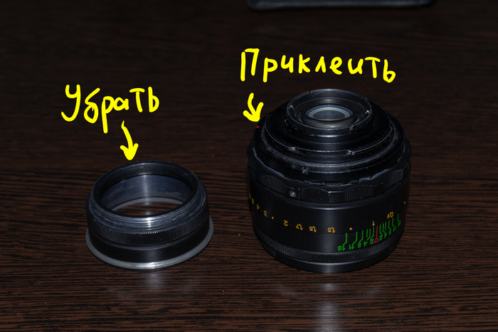 Далее у этого переходника нужно сточить край, чтобы линзоблок гелиоса свободно проходил через него