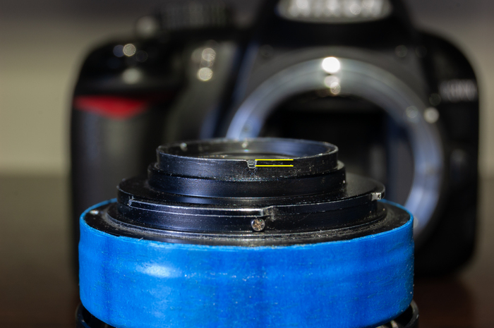 И вот на этом моменте наступает нюанс. При фокусировке на бесконечность и за нее линзоблок на вылазит за пределы переходника, что не совсем хорошо, потому что возникает риск зацепить зеркало и, как минимум, не давать нормально ему работать, а как максимум сломать. Мои тесты показали, что при фокусировке на бесконечность на D3100 объектив зеркало не цепляет