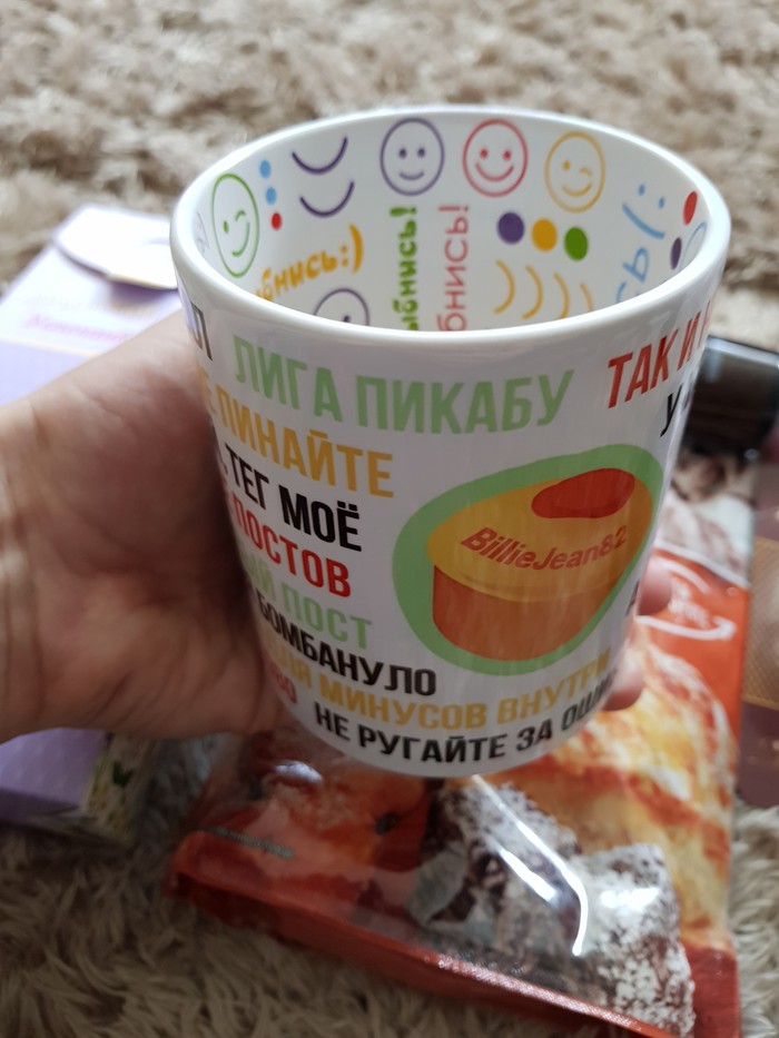 Именная - с моим ником на Пикабу! Я давно о такой мечтала и вот она! Доехала в целости и сохранности, красота! Внутри тоже весёлый принт для хорошего настроения. К кружечке прилагался набор для кексов - смесь, формочки, декор. И конечно же чай!