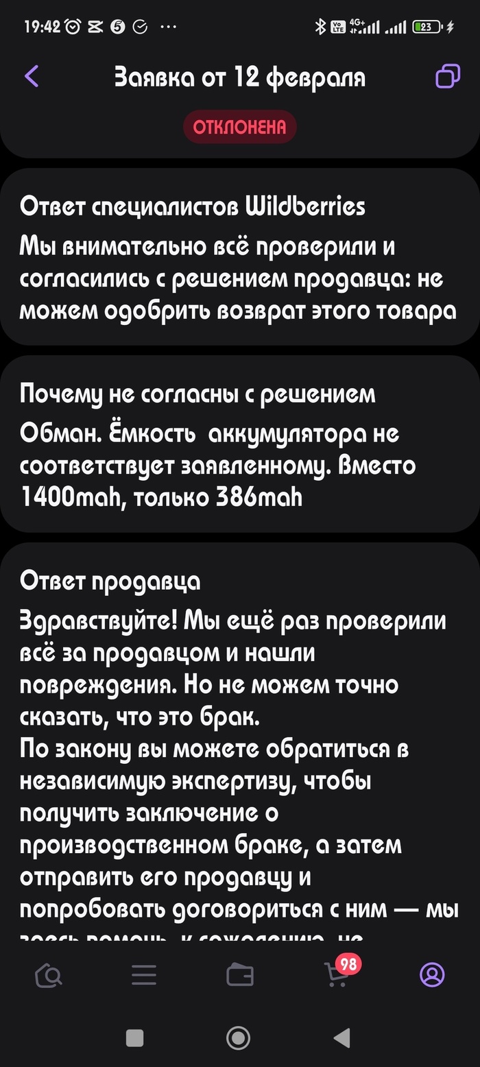 Это не единственный случай. Сестра часто пользуется ВБ и мне приходилось помогать возвращать товары. Даже сломанные вещи не с первой попытки забирают. Был случай, купила громадную клетку для кролика.. Сумма около 5000. Пришла разобранная, герметично запаянная в толстую и не прозрачную пленку без единого намека на повреждения и даже царапины. Открываем дома. Внутри разломанный пластиковый поддон и до железа отбитая толстая эмаль на решетке в нескольких местах. Удар был конкретный.. И все запаковали, как новое и отправили на продажу. Обратились сразу в день получения. Возвращали 3 недели после долгой и не быстрой переписки.