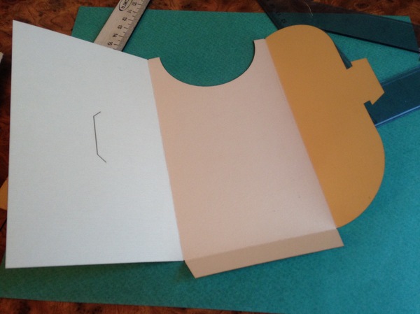 В макете вы могли заметить, что зелёных прямоугольника два. Нафига? Тот, что с острыми углами идёт на подложку (и приклеивается), чтобы внутренняя прямоугольная вставка с округлёнными углами не задевала о нижний загиб конверта (внутри), когда вставляешь её внутрь.