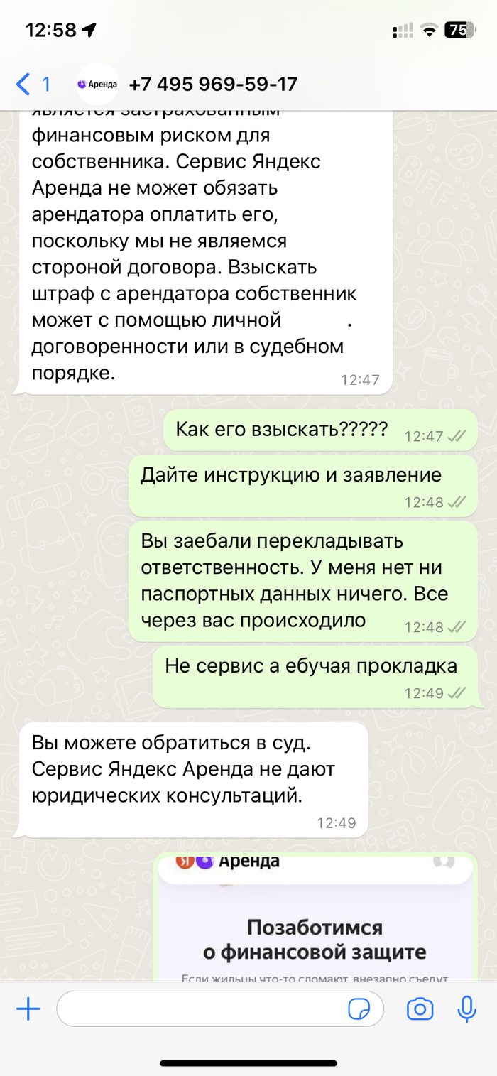 Извините, но уже пригорело. 10й раз им пишу, про нарушение жильцом пункта договора и возмещения ущерба, согласно уловиям договора, который Яндекс заключает.