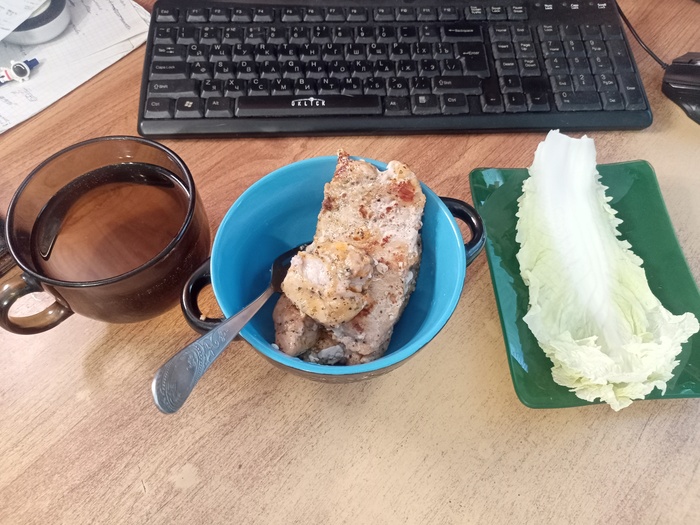 Вечером пожарил покупные "лентовские" стейки из свинины в количестве 3 штук (около полукило), но в итоге съел всего один вместе с 200гр. пекинской капусты и чашкой чая. Остальное завтра на работу отнесу и буду доедать там.